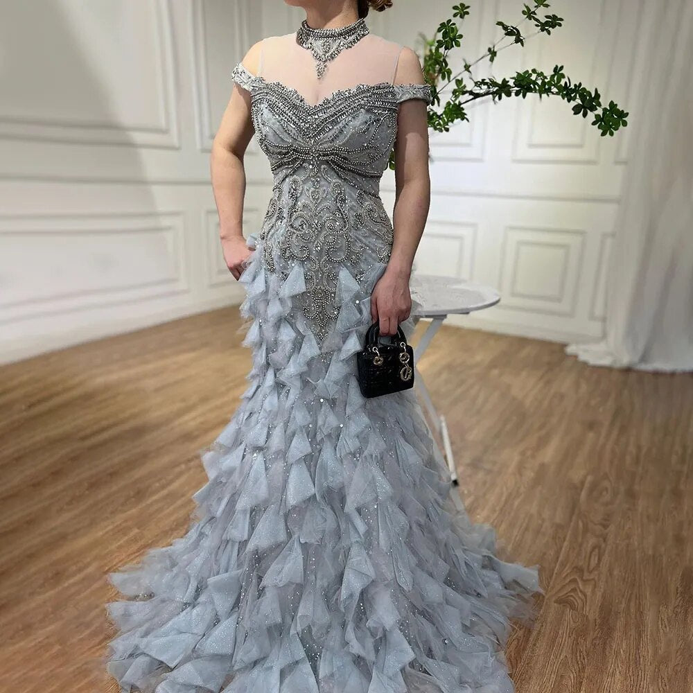 Vestidos de noche de lujo estilo sirena árabe azul con perlas y cuentas, elegantes para mujer, ideales para bodas y fiestas 2025 LA72164