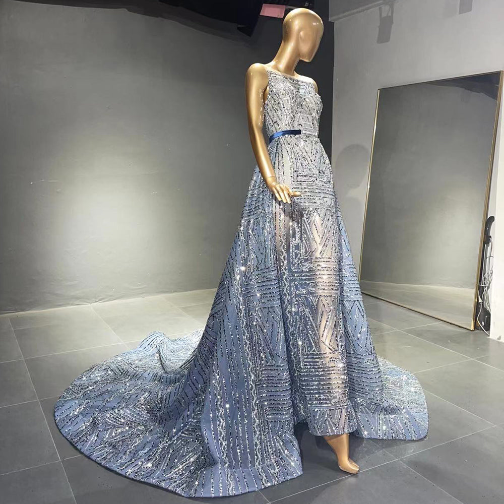 Vestidos de noche sin mangas con cuentas azules, estilo vestido de noche de lujo, corte en A, con sobrefalda para mujer, ideales para bodas y fiestas (LA71588)