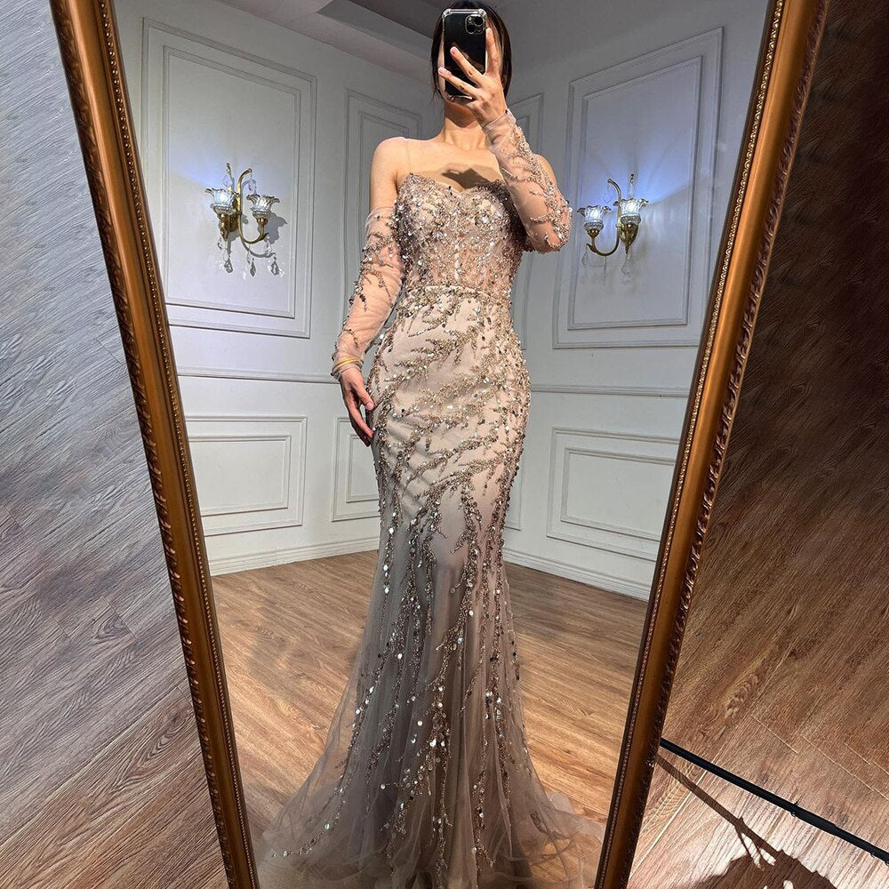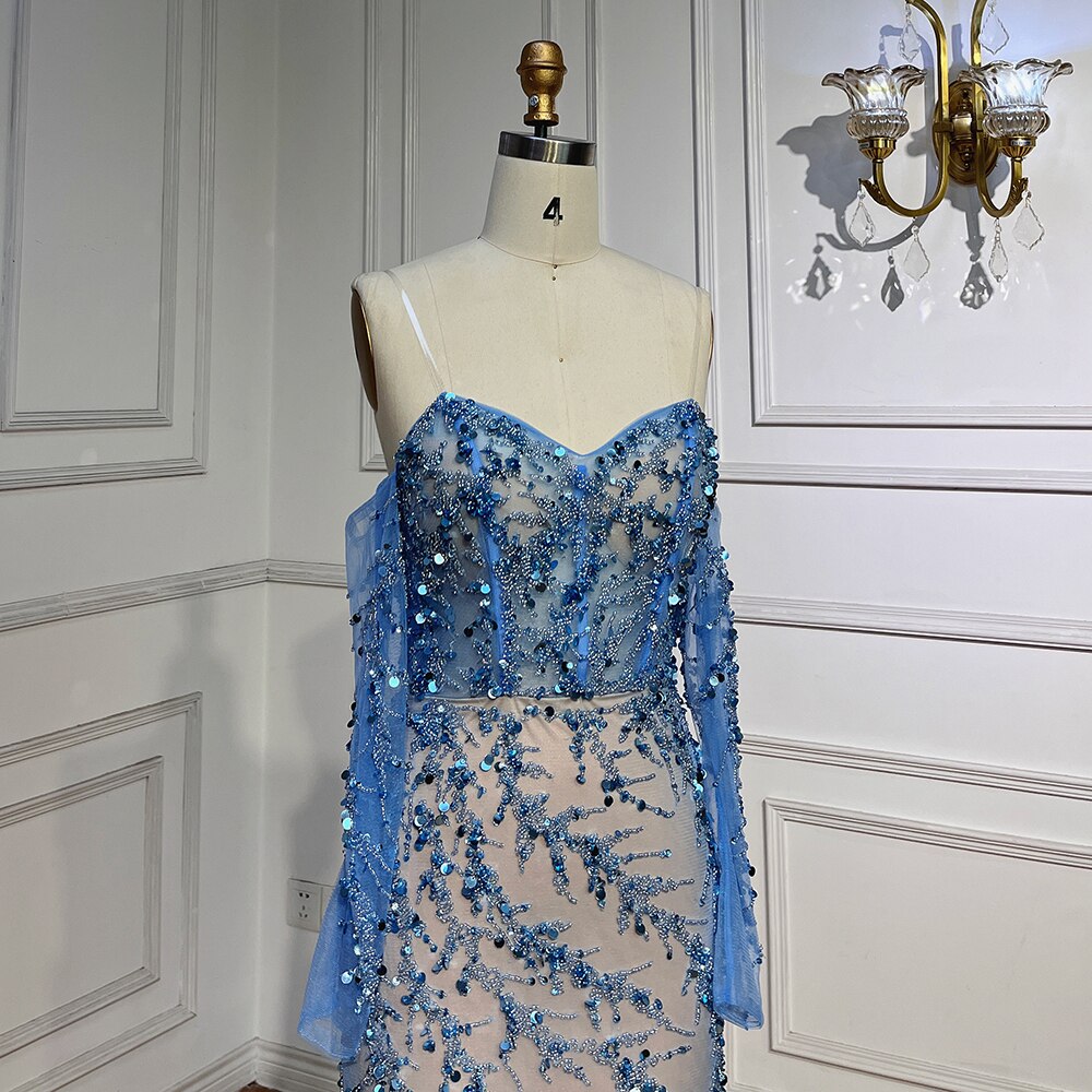 Vestidos de noche sirena de manga larga con cuello barco azul, colección 2025, vestidos formales para mujer, ideales para bodas y fiestas (LA71653C)