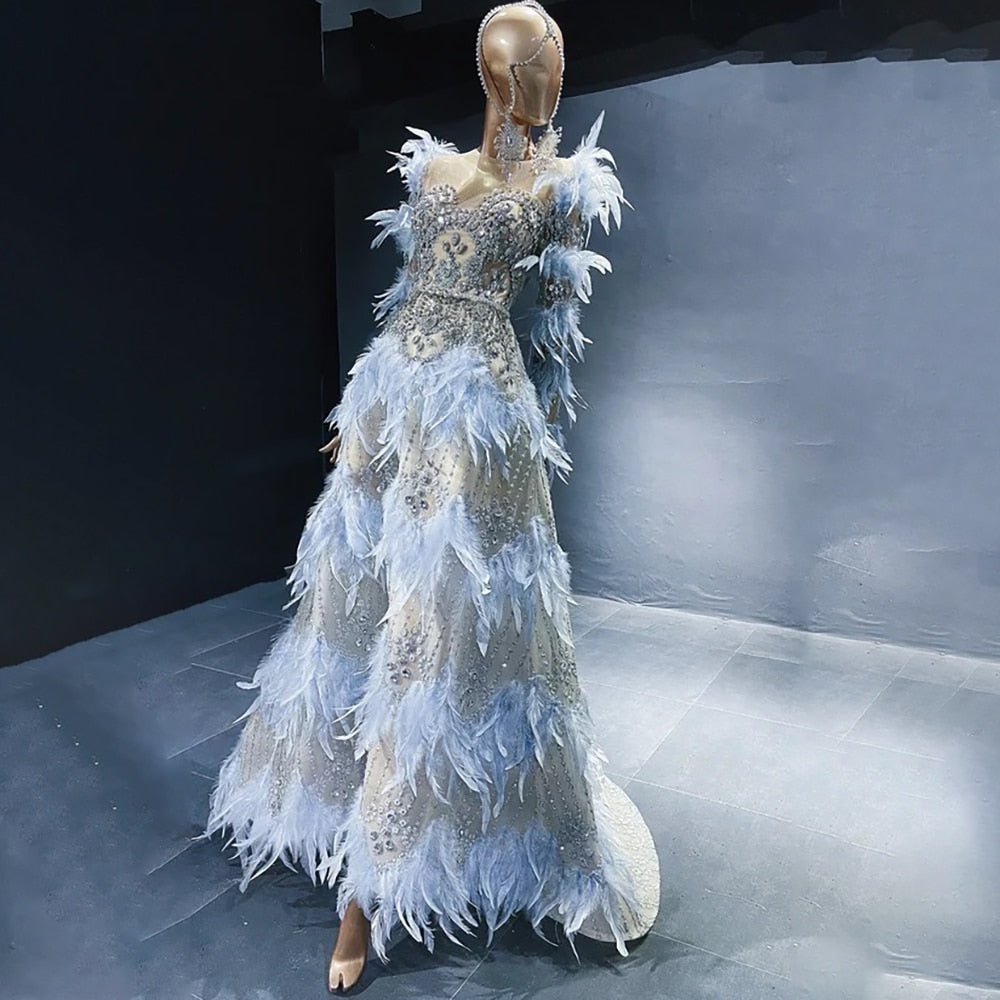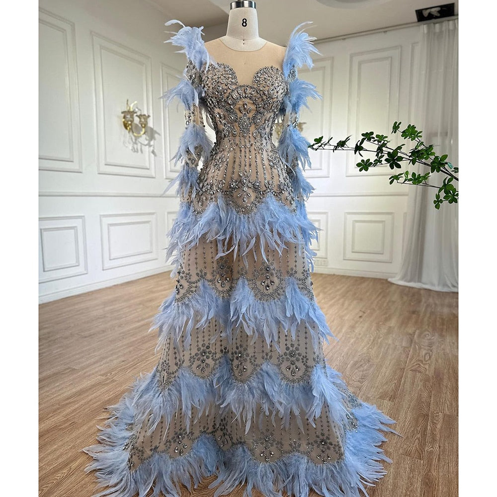 Vestido de noche elegante de manga larga con mangas largas y cuentas de lujo con plumas azules, corte en A, para mujer, modelo LA71816