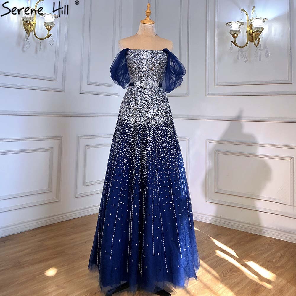Vestidos de noche de lujo azul corte A, colección 2025, con cuentas brillantes y cordones, para mujer, ideales para fiestas (LA71157A).