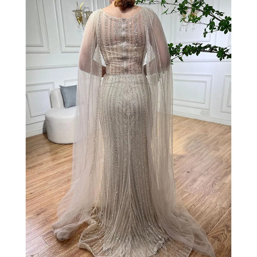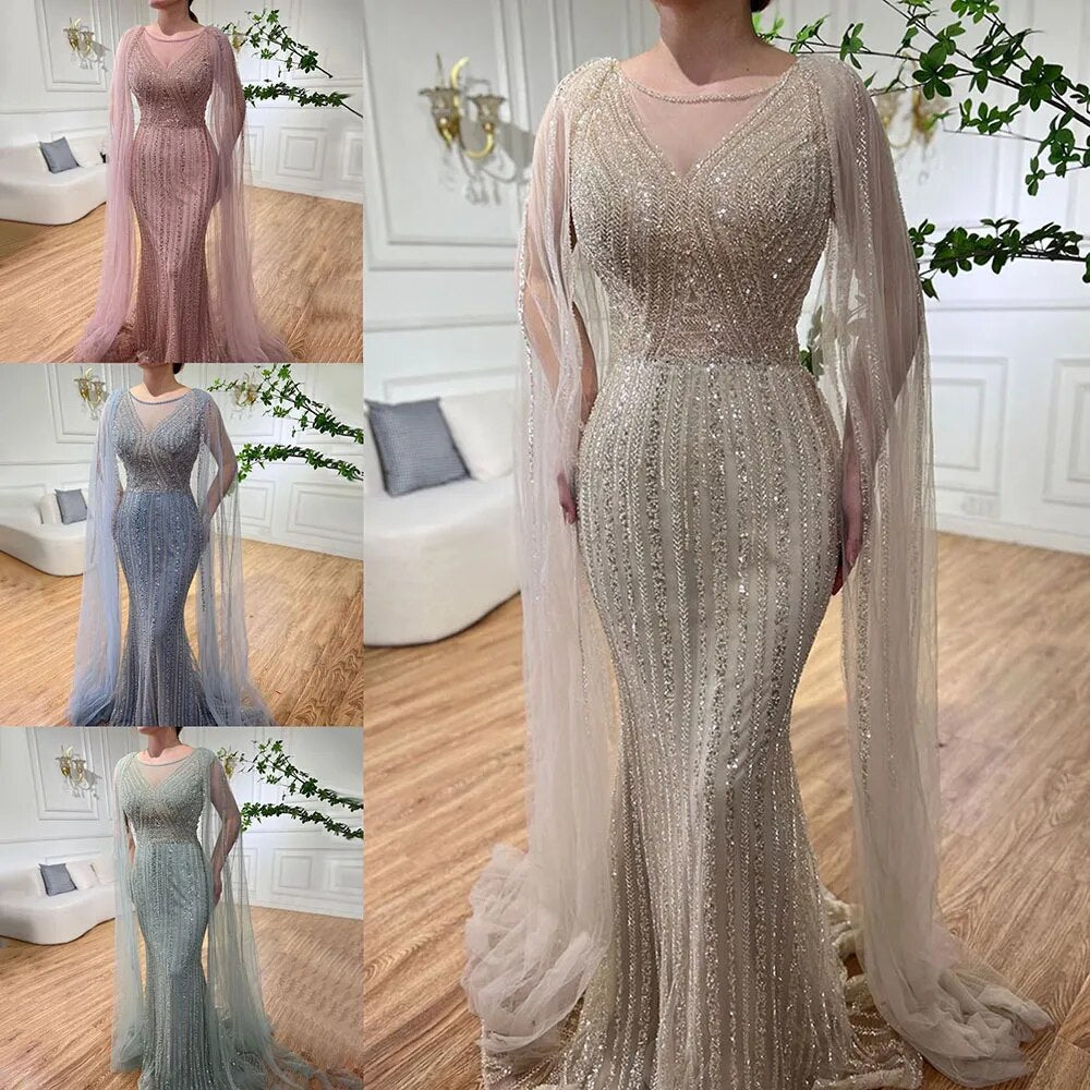 Vestido largo de noche árabe elegante con mangas de capa y cuentas, estilo sirena azul, para mujer, ideal para bodas y fiestas (2025) LA72173