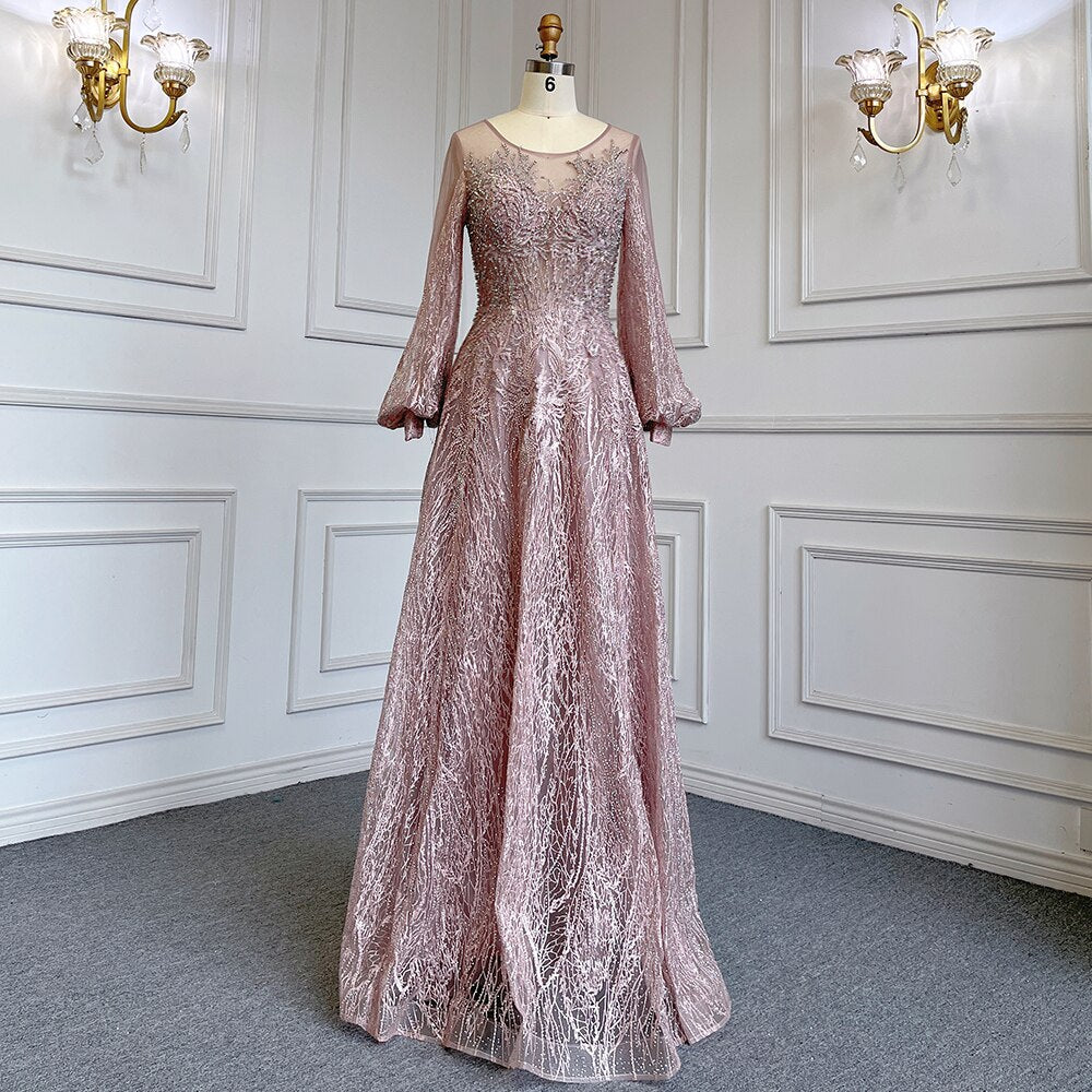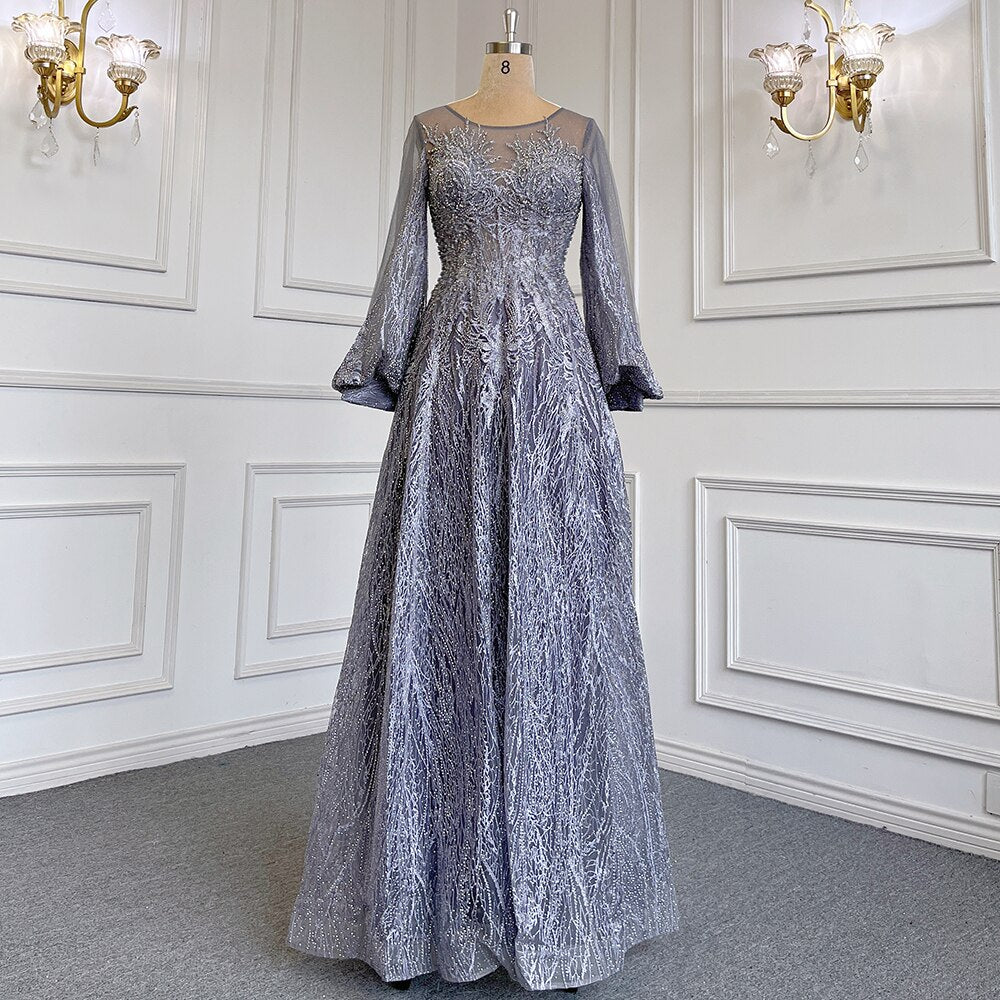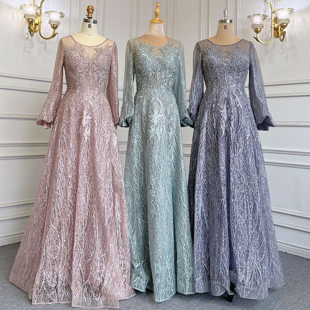Vestidos de noche azules musulmanes de corte A con cuello redondo, lujosos con cuentas de cristal, 2025 para mujer, para bodas y fiestas LA71700
