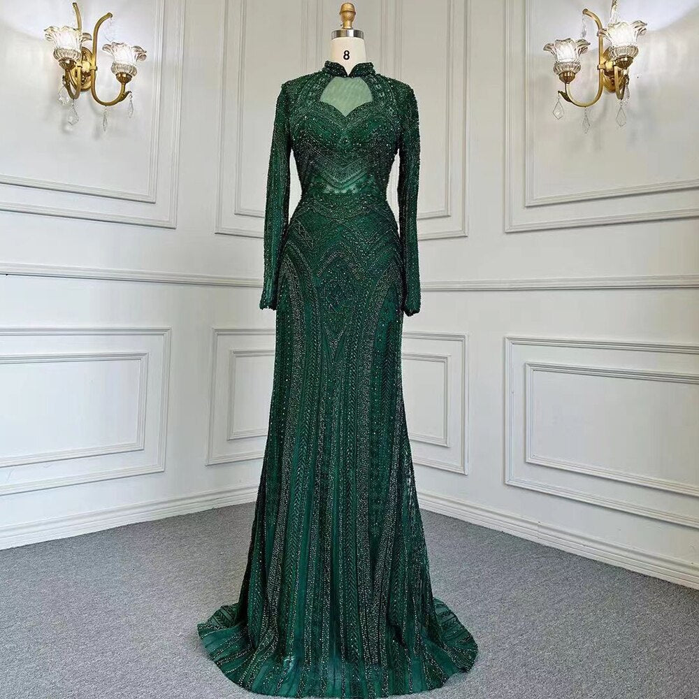 Vestidos de noche elegantes de sirena azul musulmán con cuello alto y cuentas, de lujo, para mujer, para fiestas, LA71742