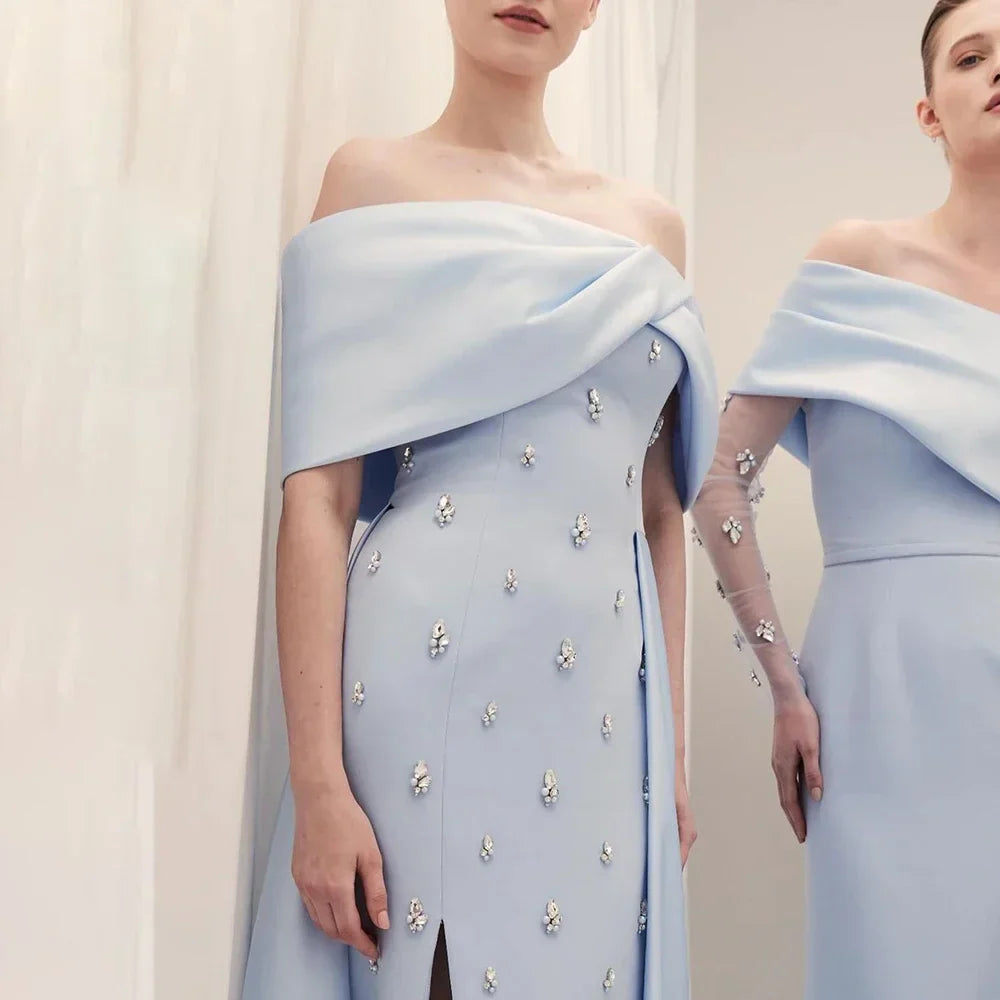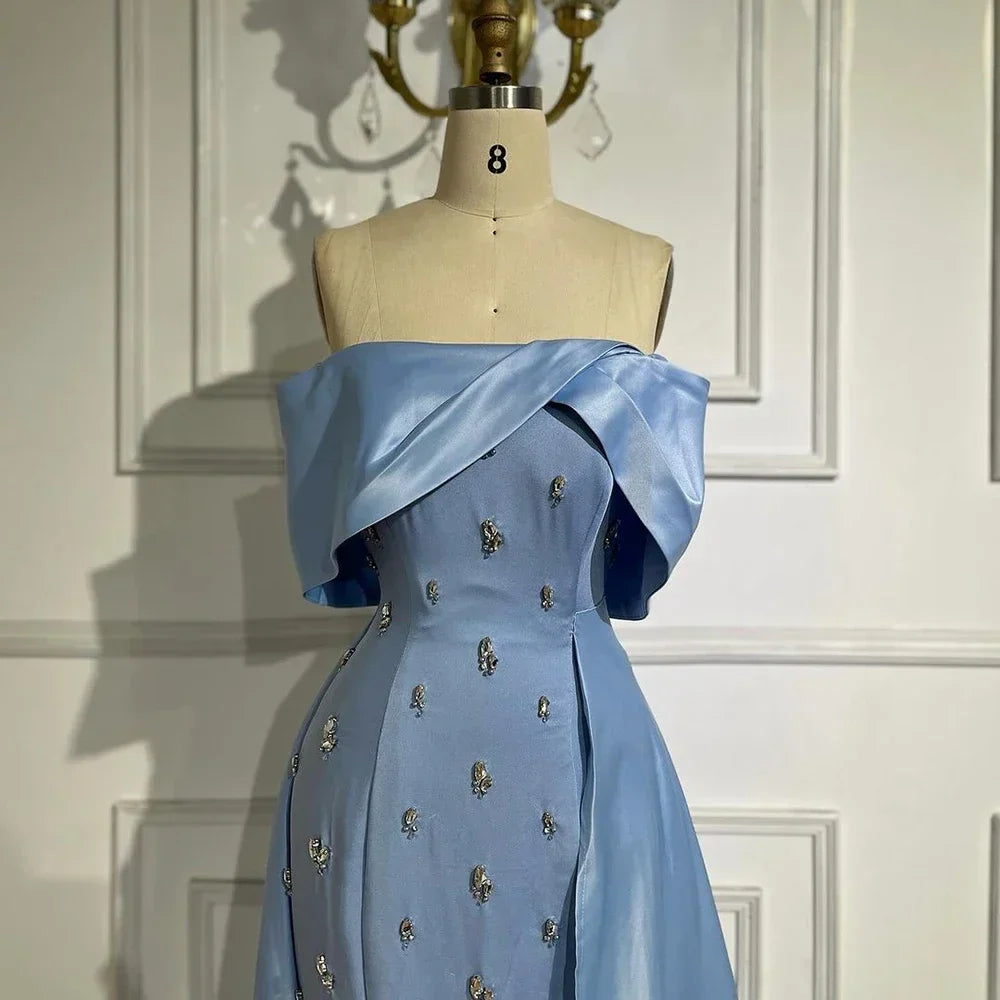 Vestido de noche azul satinado, sencillo y elegante, con escote barco y abertura alta tipo sirena, adornado con cuentas, ideal para fiestas y ocasiones especiales. Modelo LA72458