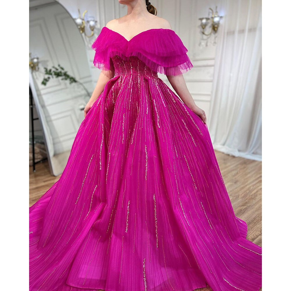 Vestido de noche de lujo fucsia corte A, escote barco, con cuentas, para mujer, modelo LA72162A
