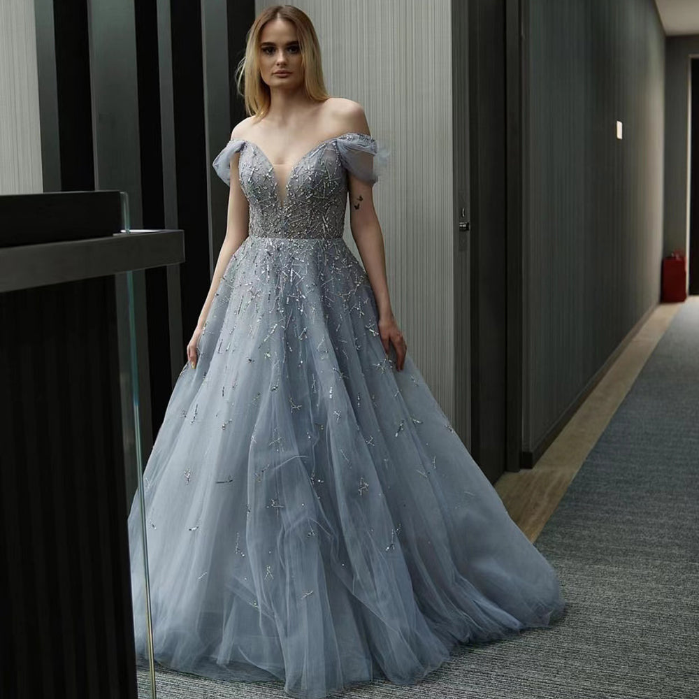 Vestidos de noche de corte A con cuentas doradas, estilo 2025, con hombros descubiertos, lujosos y sexis, largos para mujer, ideales para fiestas (LA71411A)