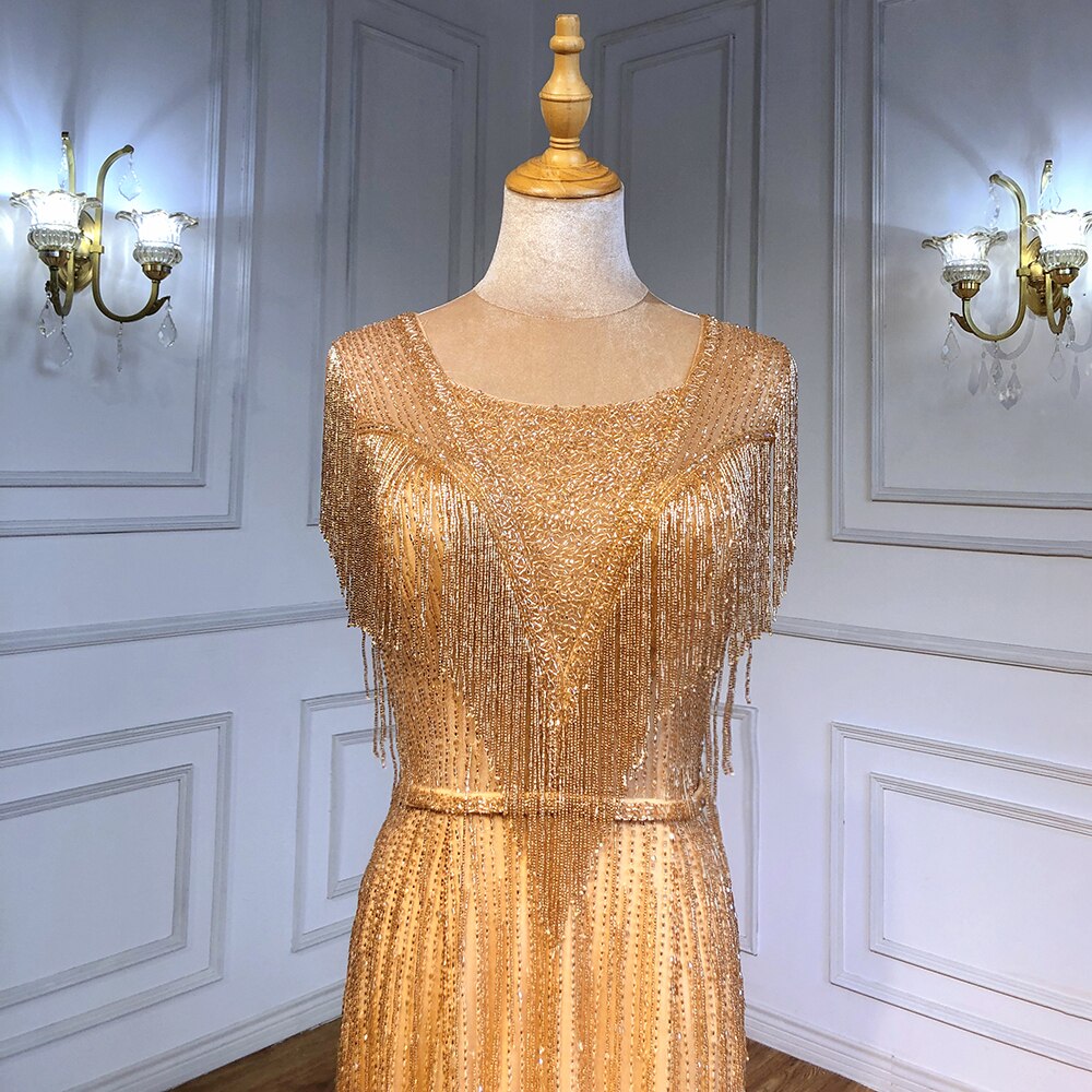 Vestidos de noche elegantes estilo sirena dorados, colección 2025, con borlas y cuentas, de lujo para mujer, ideales para fiestas (LA71435)