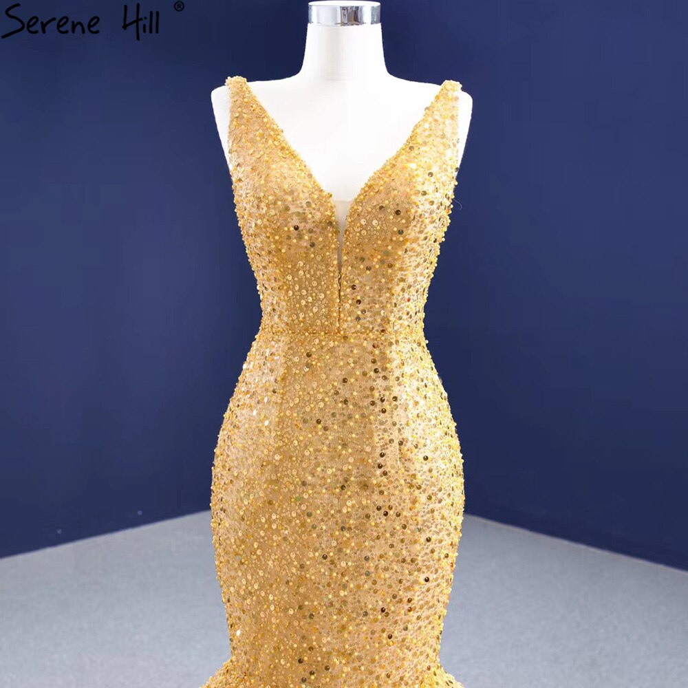 Vestidos de noche dorados estilo sirena con cordones, elegantes y lujosos, con cuentas, para mujer, ideales para fiestas (HM67290)