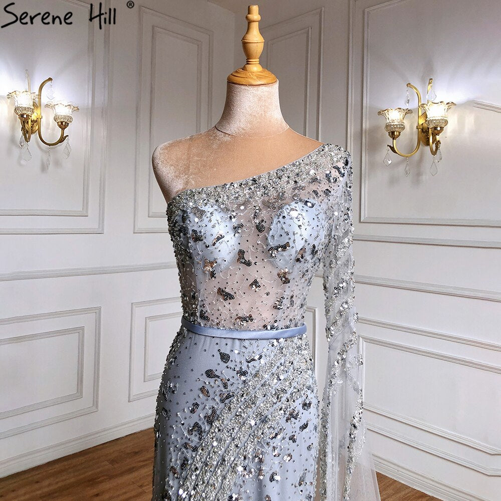 Vestidos de noche elegantes de sirena gris 2025, lujosa capa con cuentas y manga para mujer, para fiestas LA71415