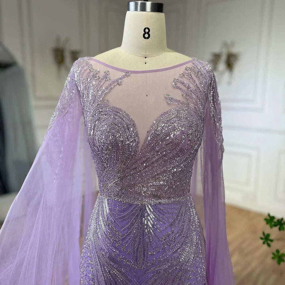 Vestido de noche elegante de sirena con mangas estilo capa y cuentas, color lila árabe de Dubái, para mujer, fiesta 2025, LA72532