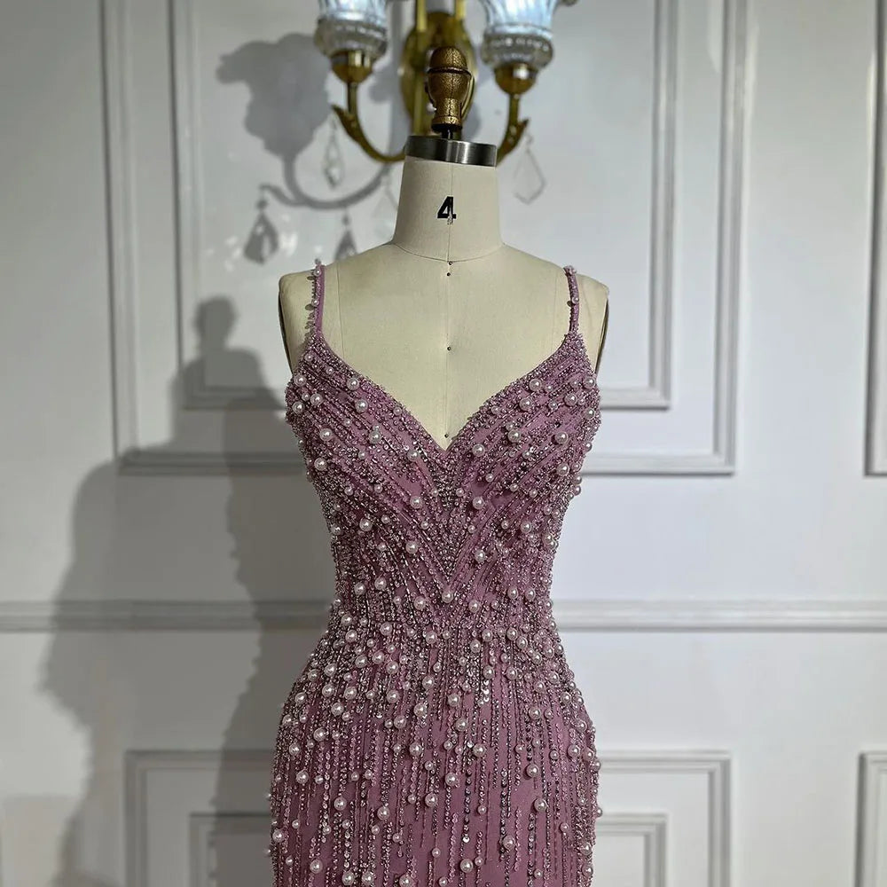 Vestidos de noche estilo sirena, color rosa árabe, con abertura alta, tirantes finos y perlas, ideales para bodas y fiestas (LA72464)