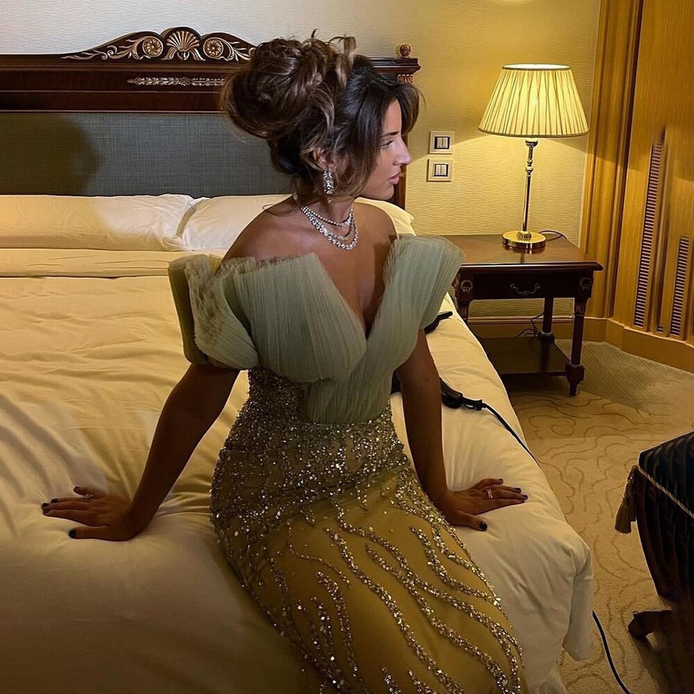 Vestido de noche elegante y sexy de sirena verde menta con escote en V, con perlas de lujo y cuentas, para mujer, fiesta LA71719