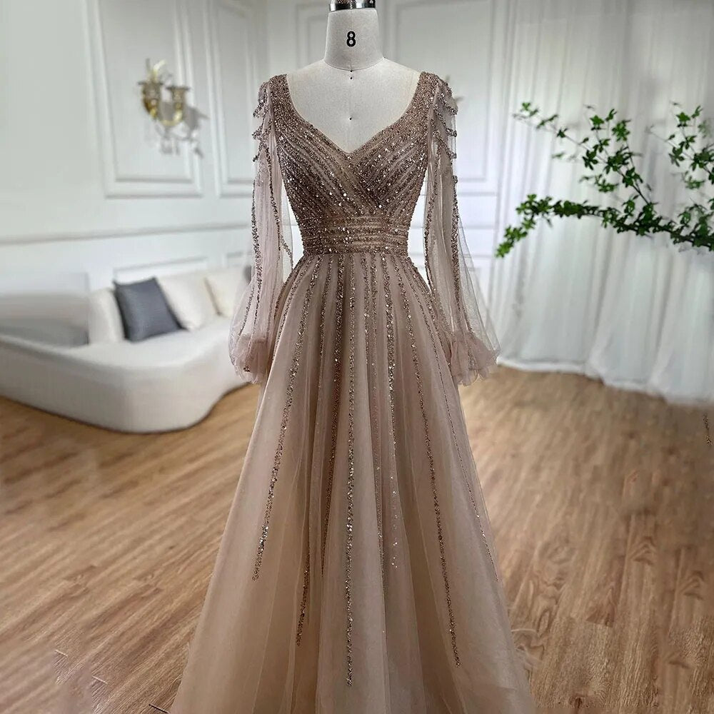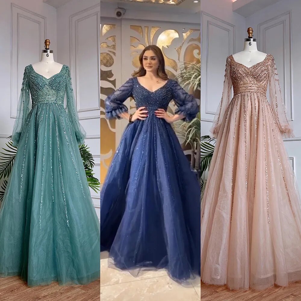 Vestidos de noche árabes de lujo con cuentas en azul marino musulmán, corte A, para mujer, para fiesta de boda, LA71867