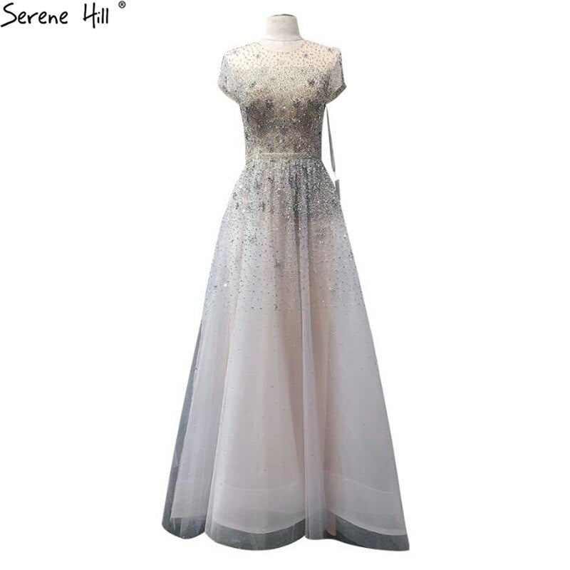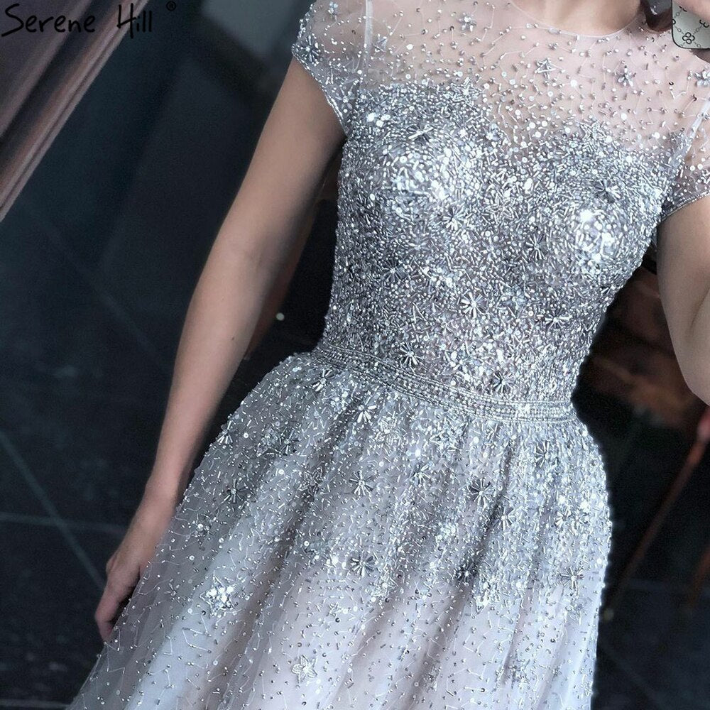 Vestido de noche de tul plateado estilo A, corte en A, estilo Dubái, manga corta, con pedrería, diseño LA70715