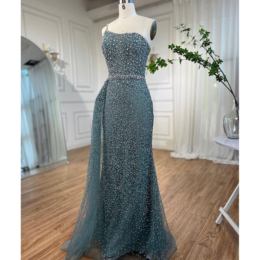 Vestido de noche turquesa de sirena, de un solo hombro y sobrefalda con cuentas, para mujer, boda, fiesta, LA72144