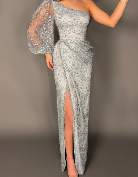 Vestido largo de noche ajustado, sexy, gris plateado, con lentejuelas, un solo hombro y abertura, modelo Y8529