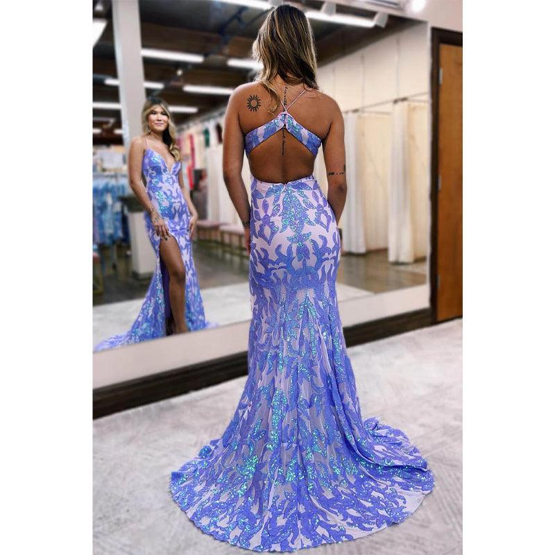 Vestido de fiesta de sirena con escote en V pronunciado y apliques de lentejuelas y abertura