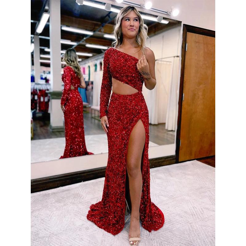 Vestido de noche sexy ajustado con un solo hombro y perlas
