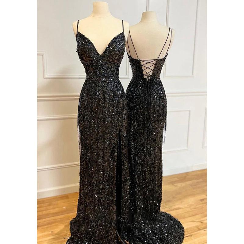 Vestido de fiesta sexy con escote en V y lentejuelas negras brillantes