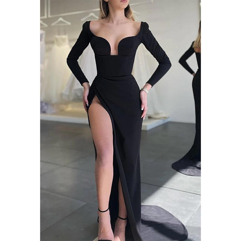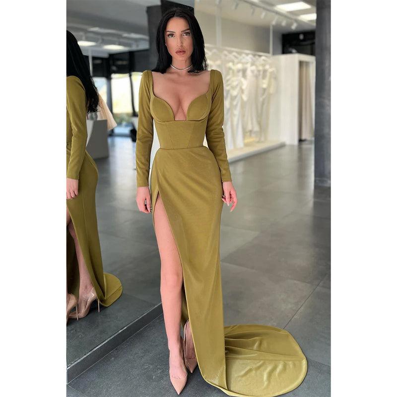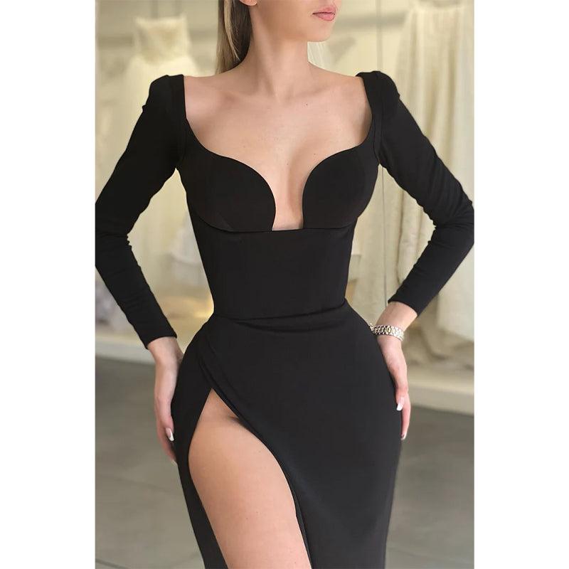 Vestido de noche formal sexy con escote en V y abertura alta y mangas largas