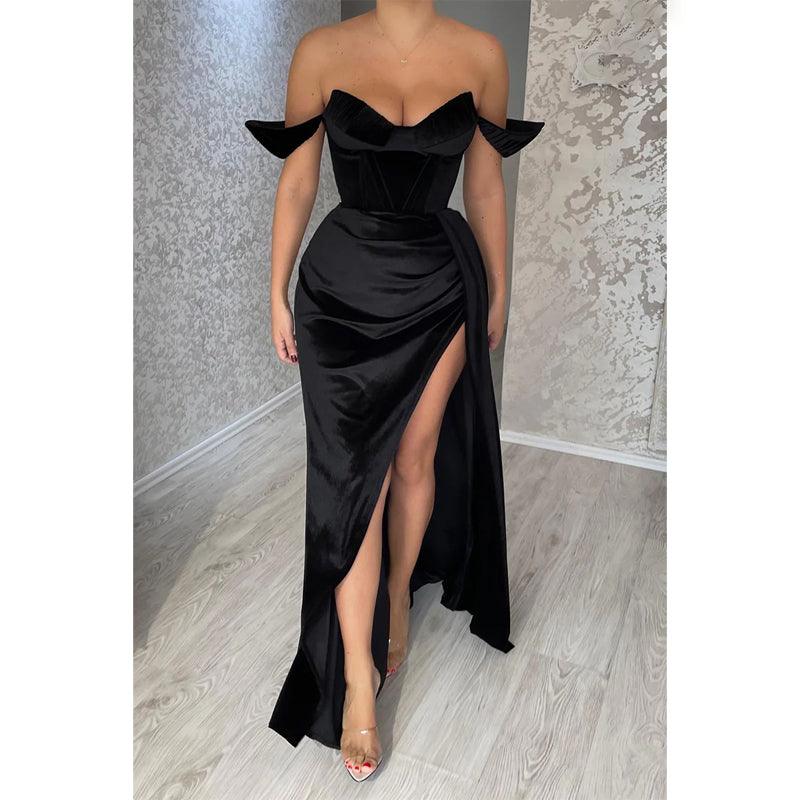 Vestido de noche formal largo negro plisado con escote en V y abertura