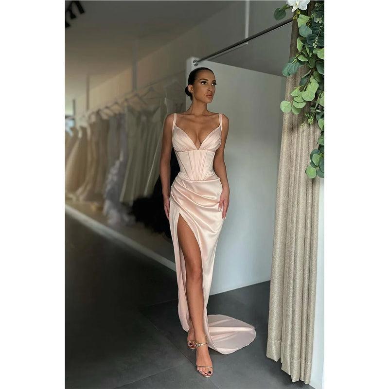 Vestidos de fiesta de sirena con escote en V, pliegues y abertura alta sexys