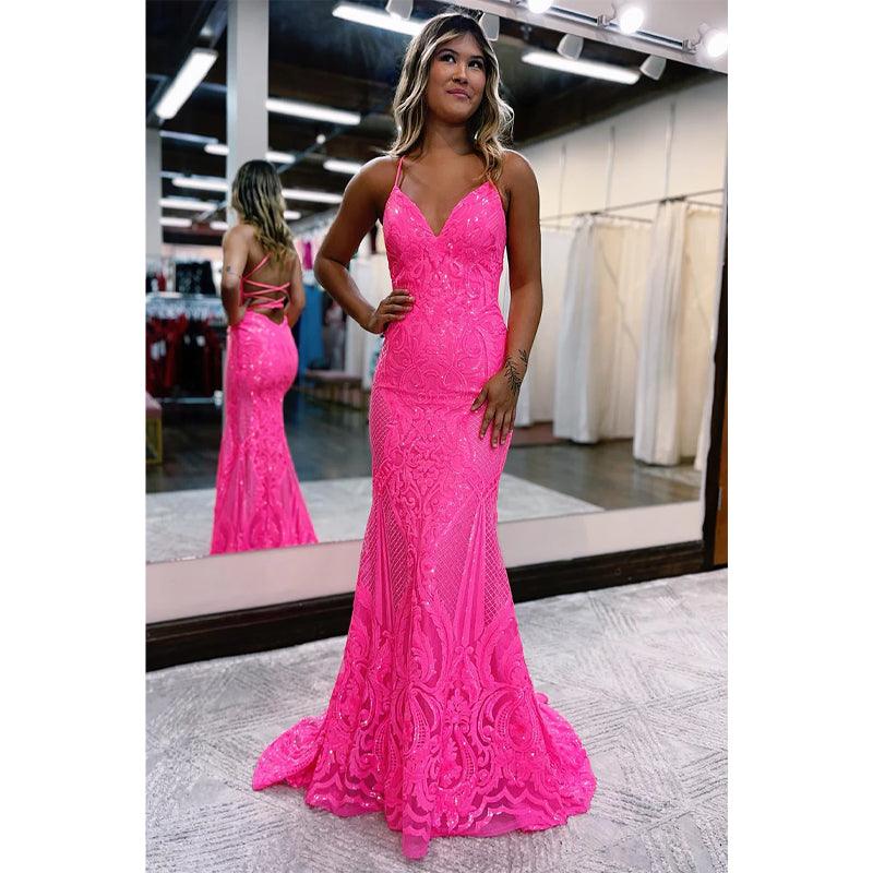 Vestido de fiesta de sirena con apliques de lentejuelas y escote en V sexy y purpurina