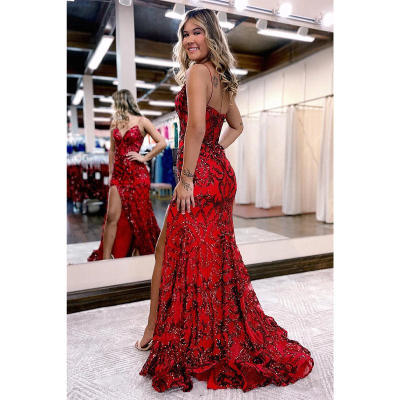Vestido de fiesta sexy de sirena con escote en V, apliques de lentejuelas y abertura brillante