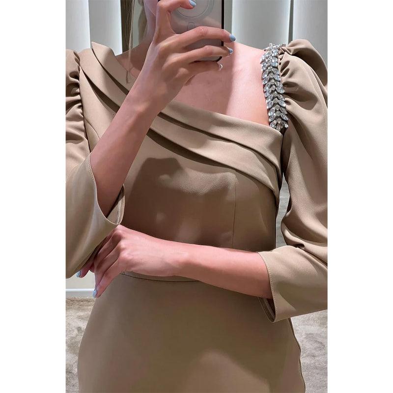 Vestido de noche formal con escote barco, mangas 3/4 y cuentas, corte tubo/columna
