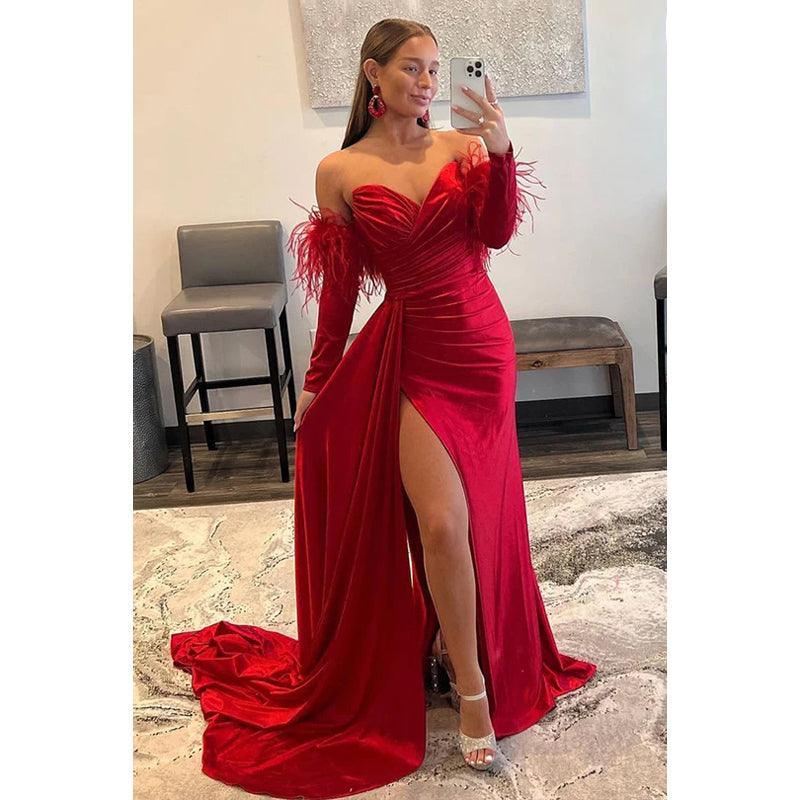 Vestido formal de noche con escote corazón, satén, pliegues y plumas para graduación