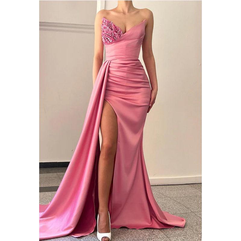 Vestido formal de noche con escote en forma de corazón, lentejuelas, abertura, sin mangas y corte tubo