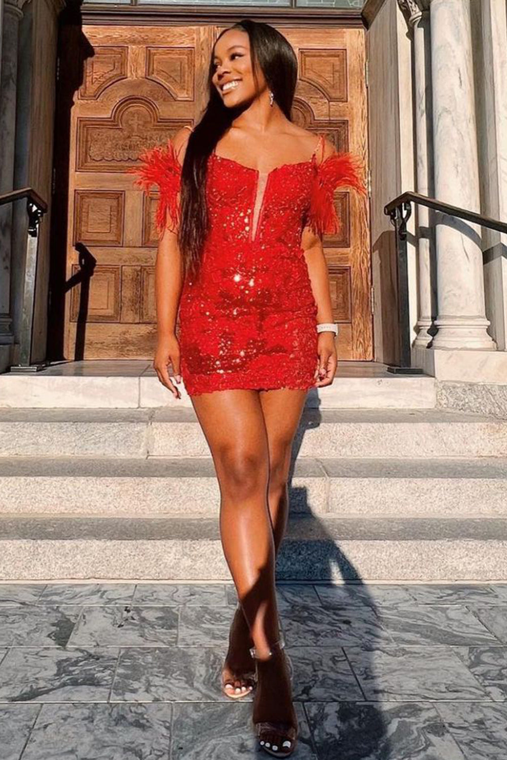 Vestido corto de fiesta estilo vainica con hombros descubiertos, lentejuelas azul galaxia y plumas.