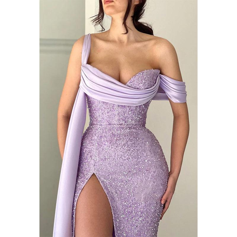 Vestido formal de fiesta largo con abertura alta y un hombro descubierto