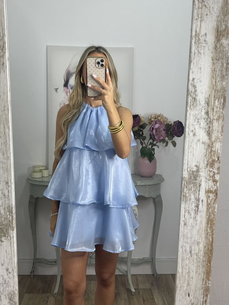 Vestido de fiesta corto de organza azul sencillo con cuello halter y capas, modelo Y8089