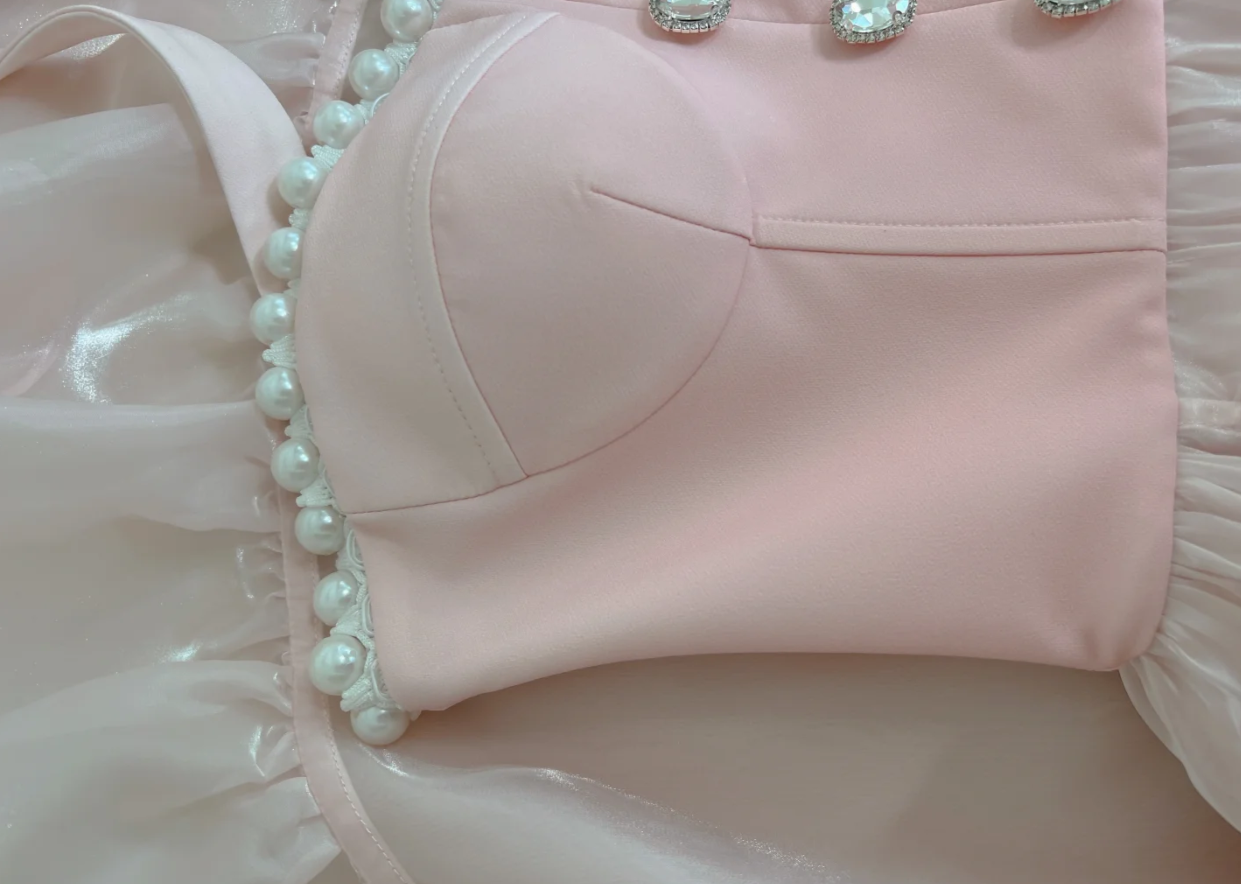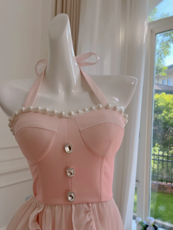 Vestido sencillo de fiesta rosa con escote halter, tul, perlas, cuentas y volantes asimétricos (Y8582)