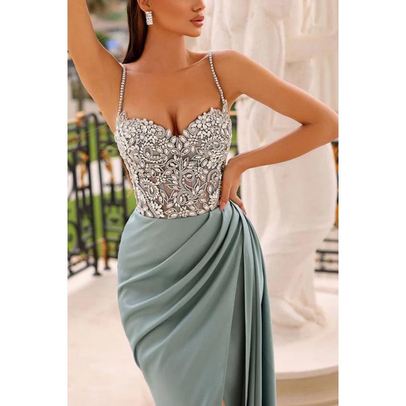 Vestido de noche de satén fruncido con cuentas y tirantes finos