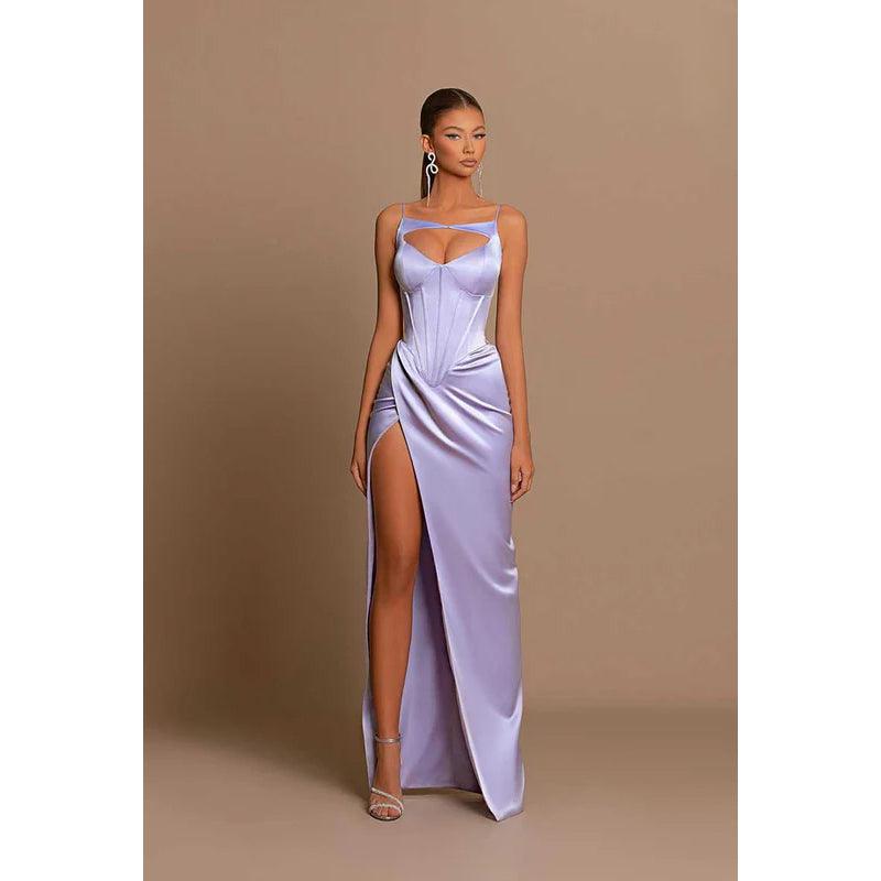 Vestido largo formal de noche con tirantes finos y aberturas para graduación