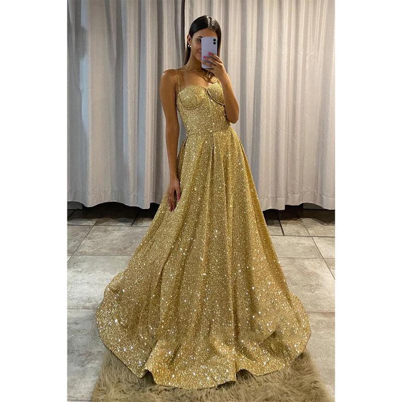 Vestido de fiesta dorado con tirantes finos y purpurina