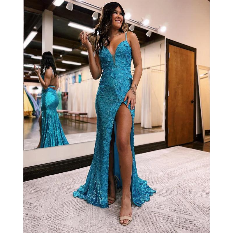 Vestido de fiesta largo con tirantes finos, apliques de lentejuelas naranjas y abertura
