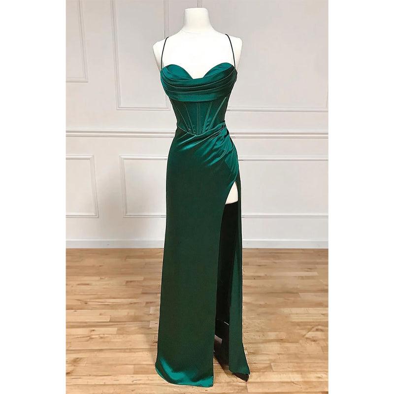 Vestido de fiesta largo con tirantes finos, pliegues y abertura alta