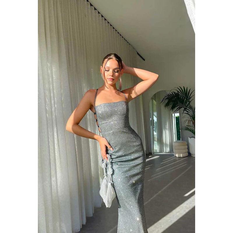 Vestido de noche largo con tirantes finos, lentejuelas y brillantes