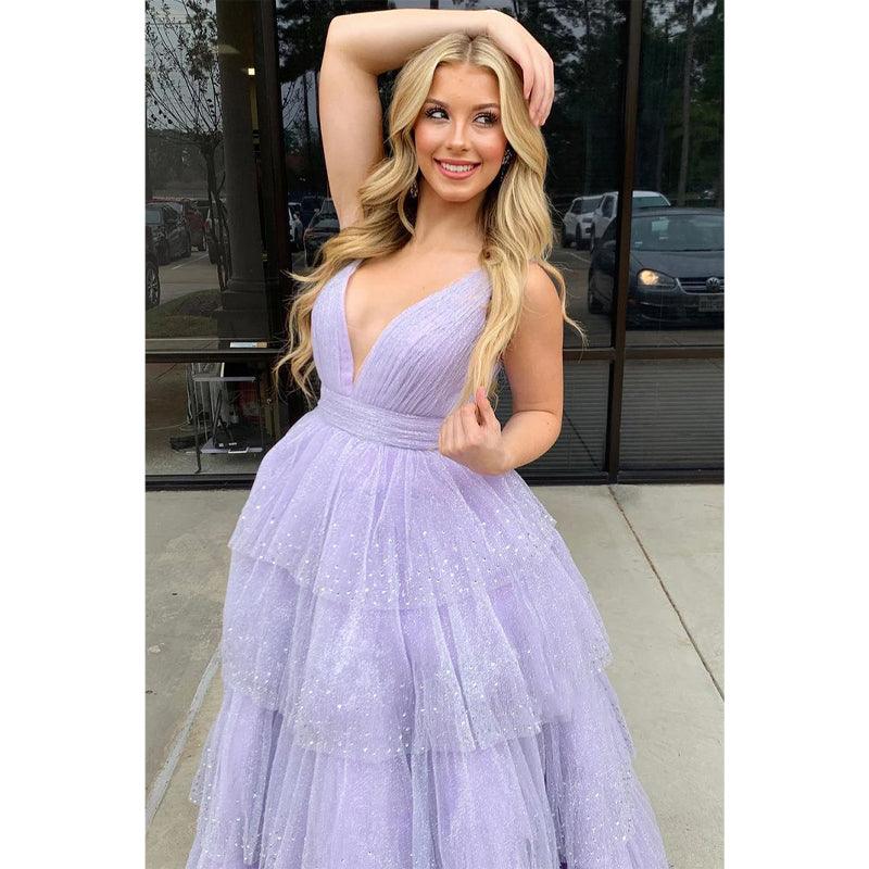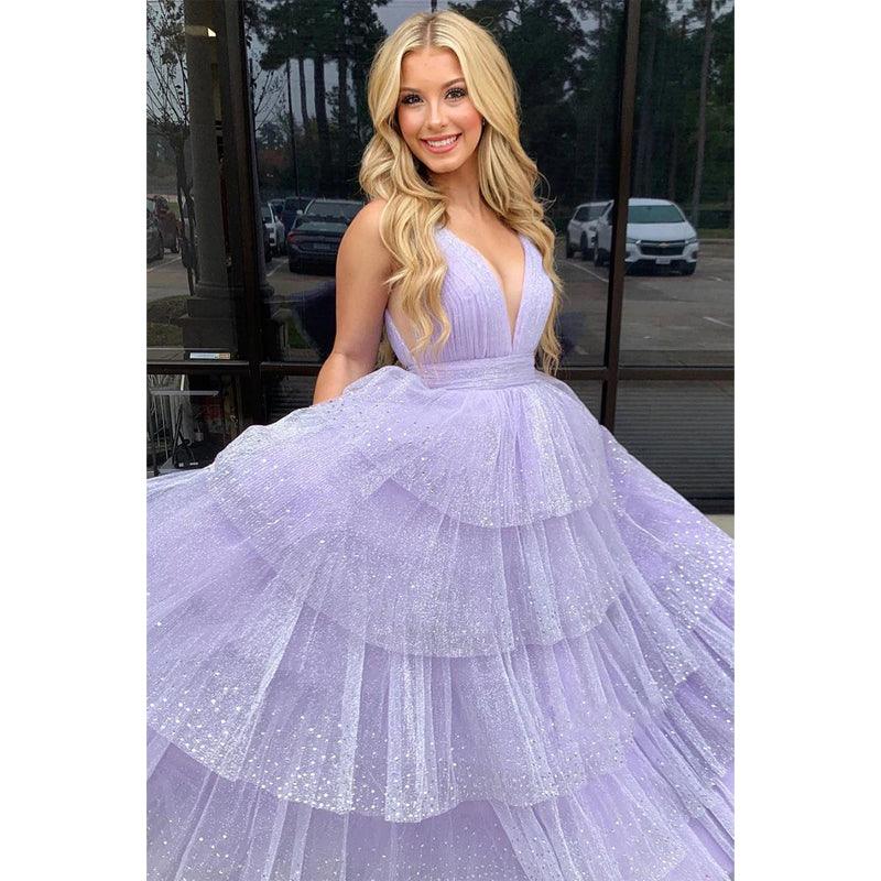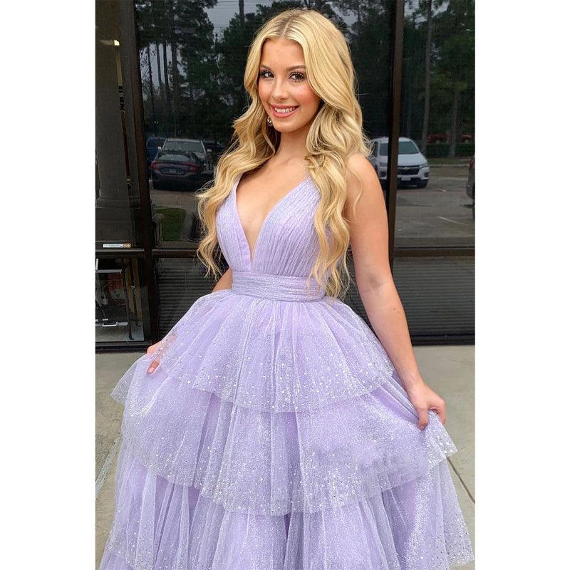 Vestido de fiesta largo con escote en V en lila brillante, vestido de noche