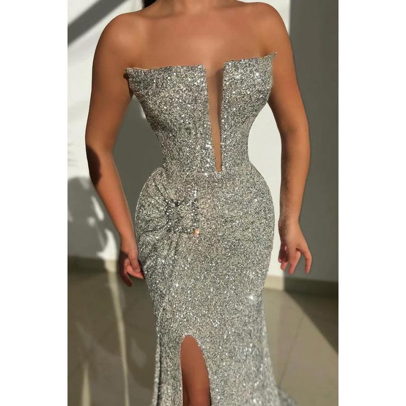 Vestido de fiesta de graduación con escote en V, sin mangas, lentejuelas y abertura en forma de trompeta