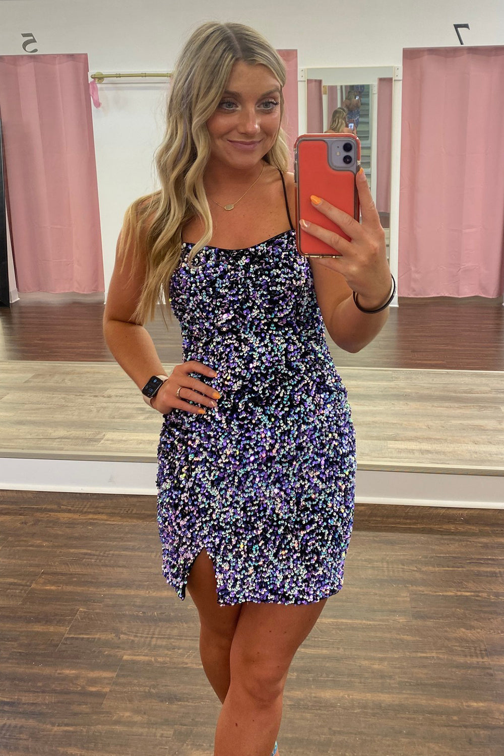 Vestido ajustado de lentejuelas con tirantes finos morados brillantes para baile de bienvenida