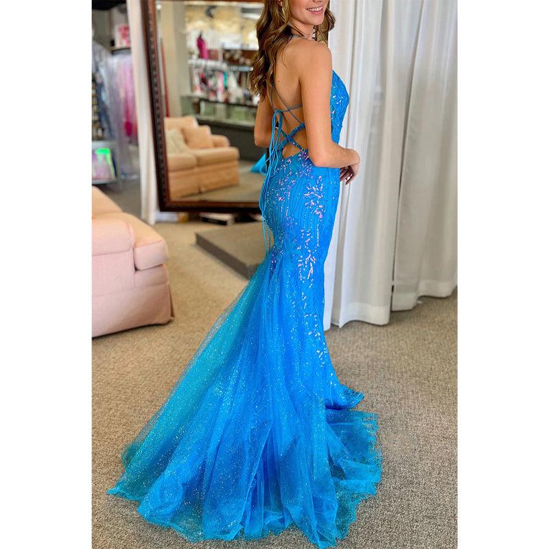 Vestido de fiesta de graduación con tirantes finos brillantes y apliques de encaje estilo trompeta