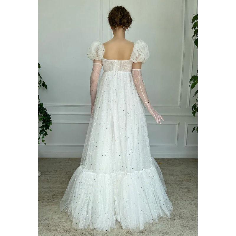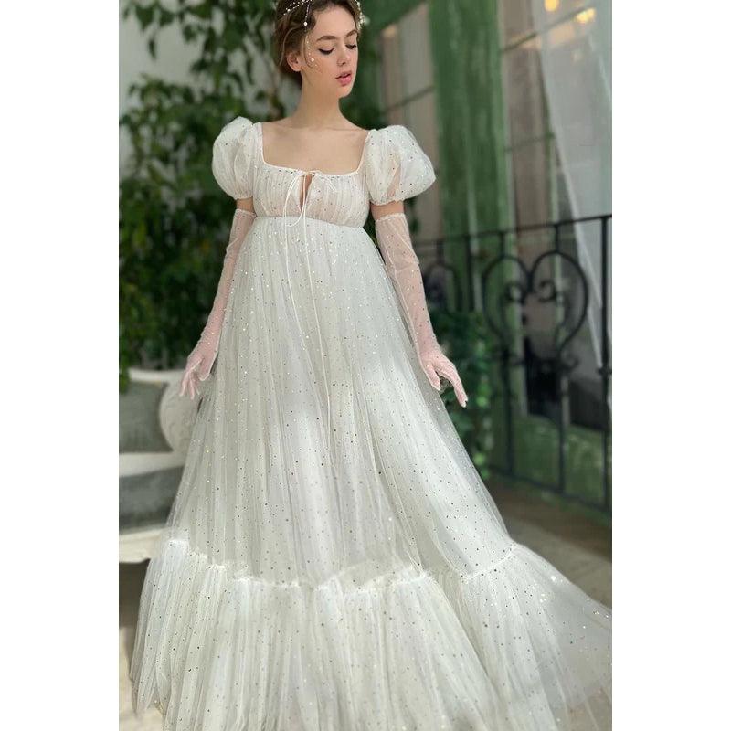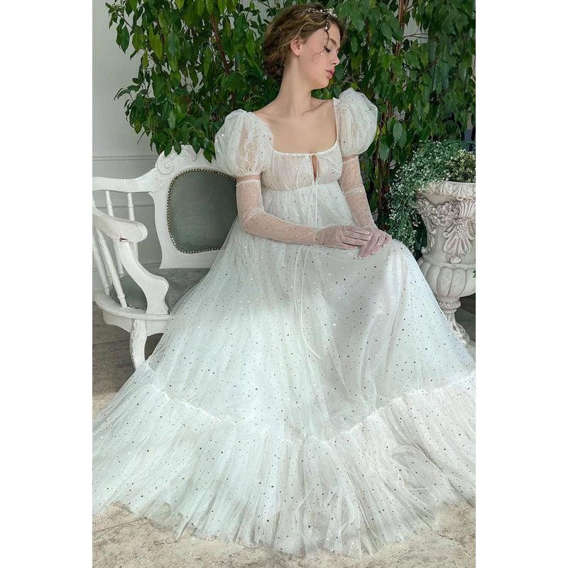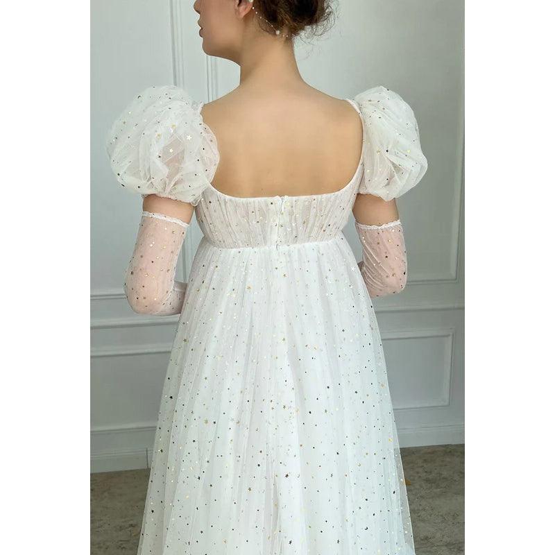 Vestido de fiesta largo de tul con escote cuadrado, mangas cortas abullonadas y corte A