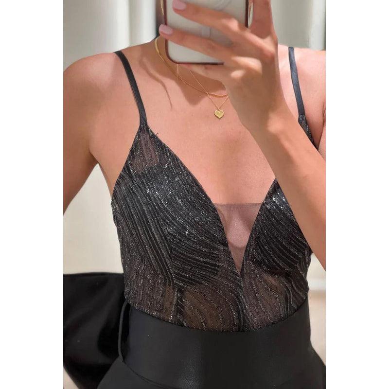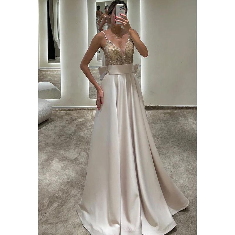 Vestido de noche largo de satén con lentejuelas, tirantes finos y escote en V, corte A