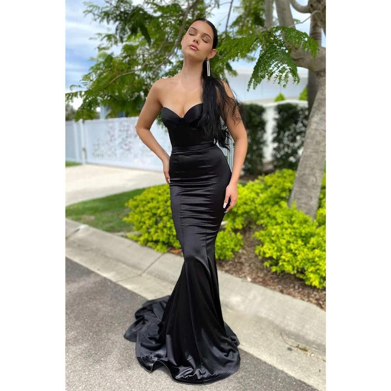 Vestido de fiesta largo de sirena de satén negro con escote corazón