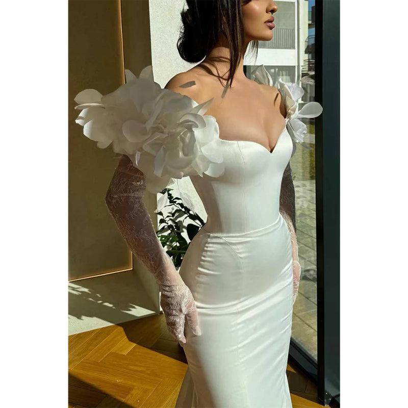 Vestido de noche de fiesta con escote en forma de trompeta, manga larga y adornos florales
